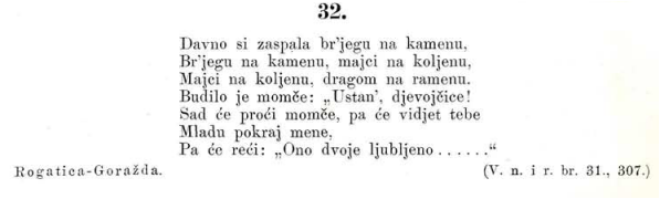 Kopija ljubaznošću Damijane Kisovec, Narodna in univerzitetna knjižnica Ljubljana, Slovenija. Varijantu pjesme zabilježio Ludvik Kuba ljeta 1893. godine u Rogatici.